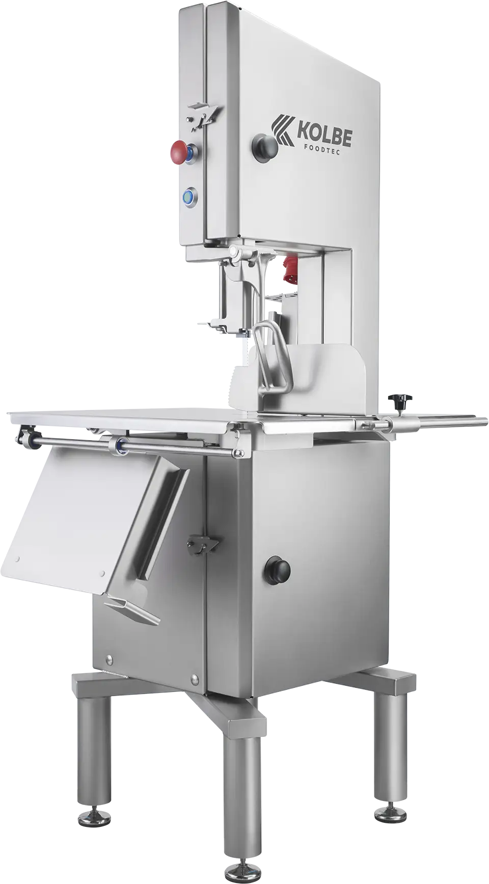 Maschine aus Edelstahl / Fester Tisch / Portionieranschlag / Materialdrücker / Druckknopfschaltung / rostfreie Räder / Motorbremse / Motorschutz / 4 höhenverstellbare Schwingmetallfüße / Anschlusskabel mit CEE-Phasenstecker / 1 Bandsägeblatt / Gleitschiebetisch / Restehalter